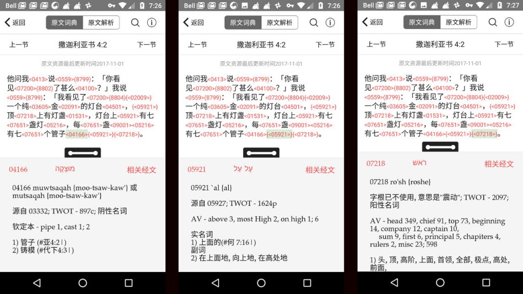 下面我们用微读圣经来看撒迦利亚书4章2节中这个“管子”<H4166>和其有关的词之原文编号。首先,我们除了看到这个<H4166>原文编号之外,还看到在中文里并没有翻译出来的两个原文编号:<H5921>和<H7218>: