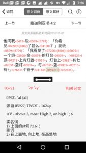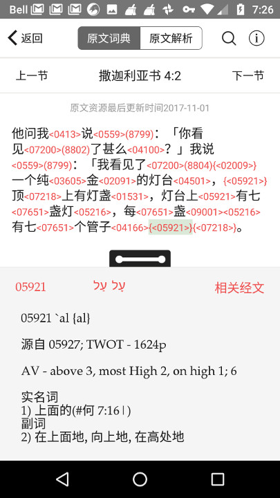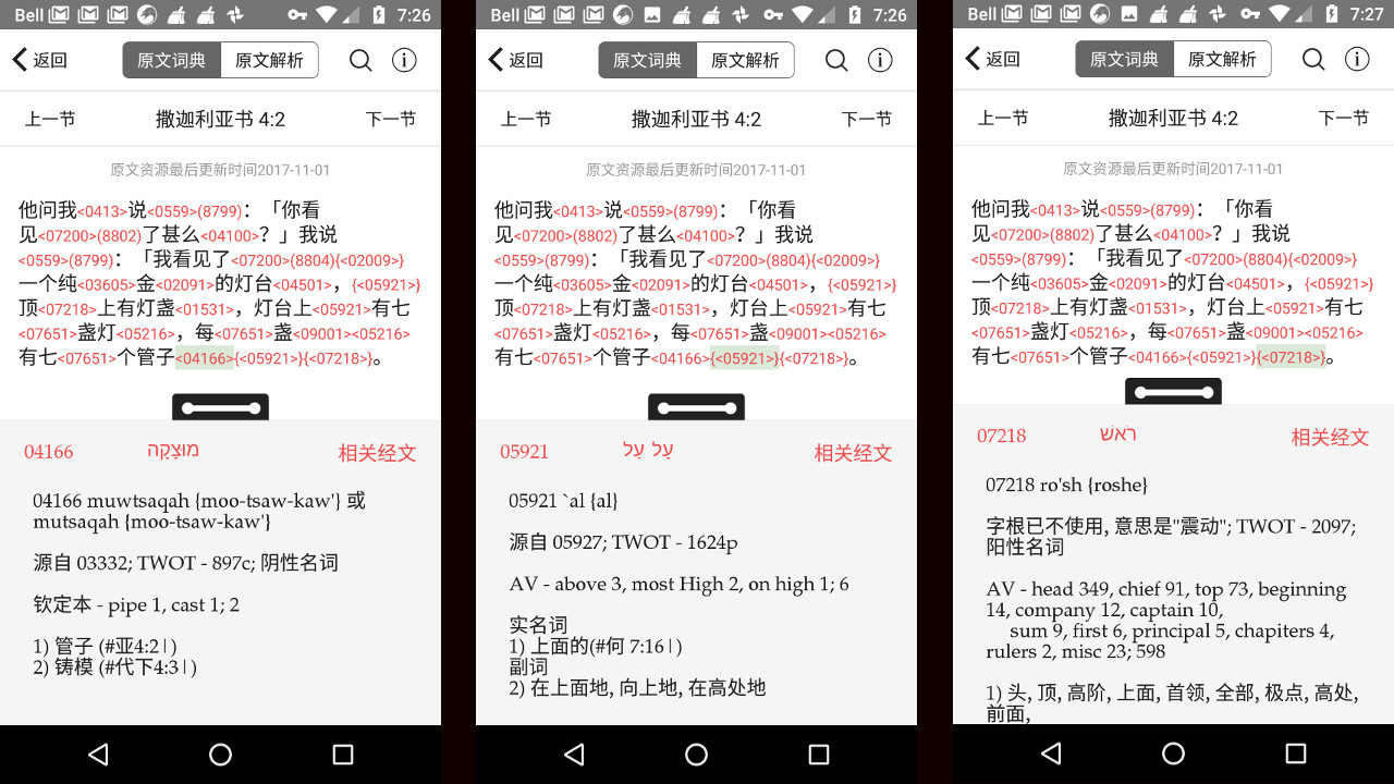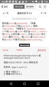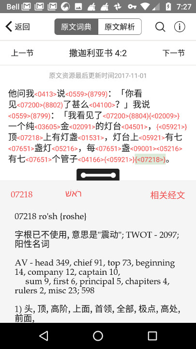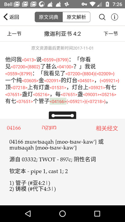 下面我们用微读圣经来看撒迦利亚书4章2节中这个“管子”<H4166>和其有关的词之原文编号。首先,我们除了看到这个<H4166>原文编号之外,还看到在中文里并没有翻译出来的两个原文编号:<H5921>和<H7218>: