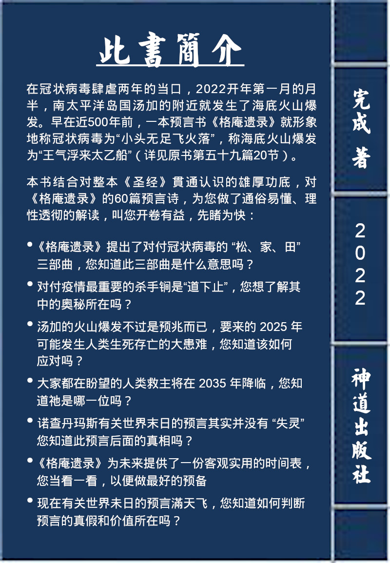 以下,从我们在2022年出版的《此言不中非天语——格庵遗录探解》中将与此相关的部分摘录出来。注意预知梦画家龙树谅所说的2025年7月5日早上5时许要发生的事,与我们出版的书中所解读的2025乙巳年的7月20日,相差15天,而这个差数15,刚好与汤加火山发生的日期15日吻合,也与龙树谅所记载的预知梦数目15一丝不差。相信这不是巧合,而是神用这个代表“神的帮助”之数字15,来警示这个崇尚数字,使用数字,但却不明数字真意的时代:人祸是导致天谴的起因,而天灾是上天叫人类彻底悔改的最后且唯一无奈之举。