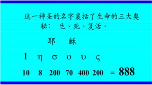 喜欢数字8的中国人,会一下子看到:这三个与耶稣降生有关的原文编号,都含有这个谐音为“发”的数字。有些人不知道的是,由“耶稣”的希腊文字母所对应的数字而加和出来的数字,叫“数码”,恰好等于888。你看,钟爱数字8的中国人,是不是与耶稣有千丝万缕的联系?